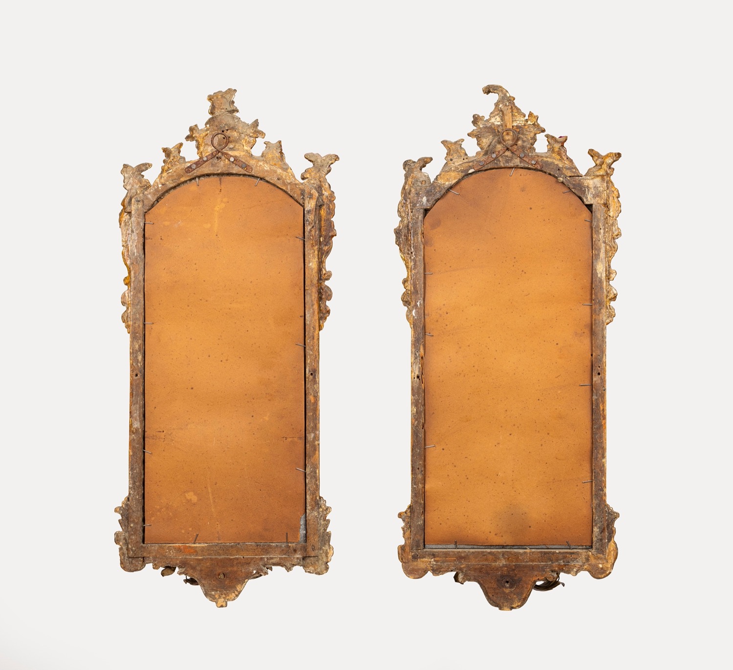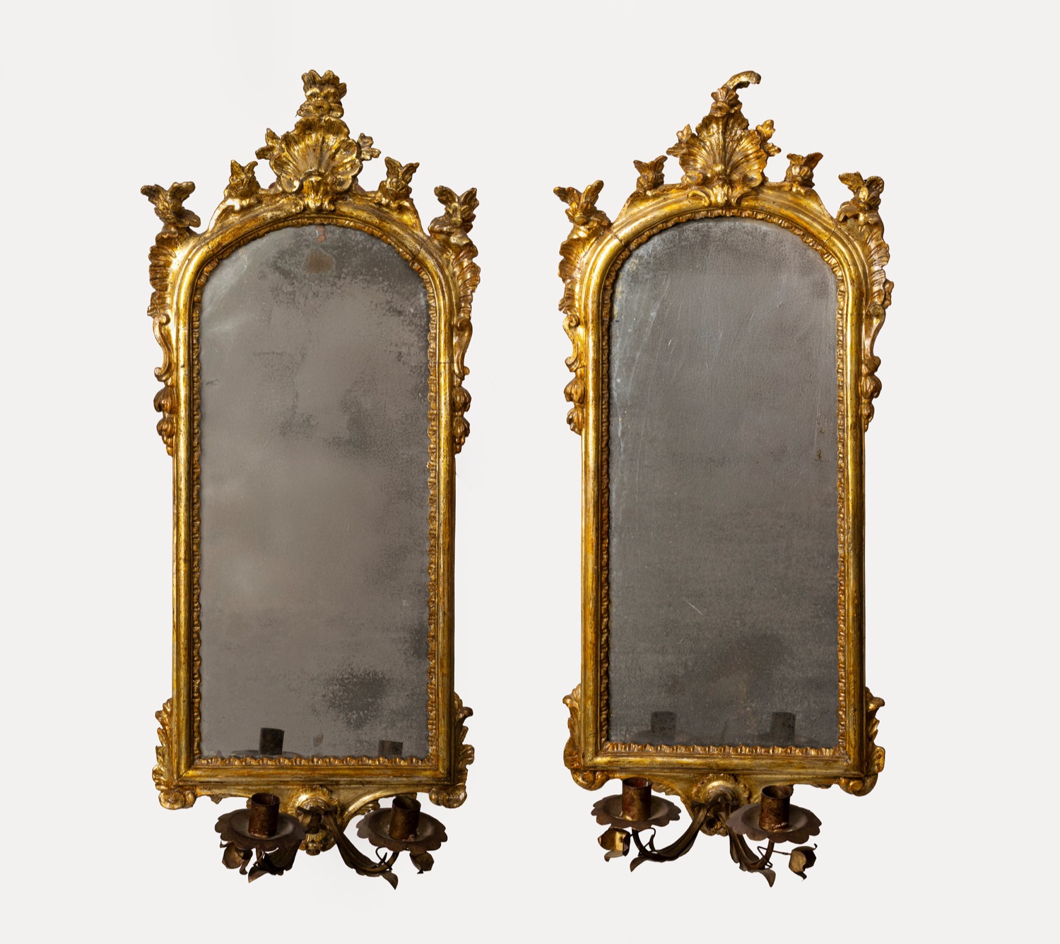 cornici decorate da fregi a volute di foglie e fiori, la cimasa centrata da valva di conchiglia