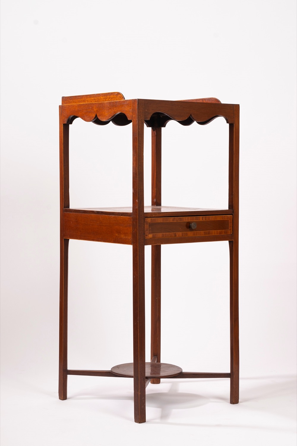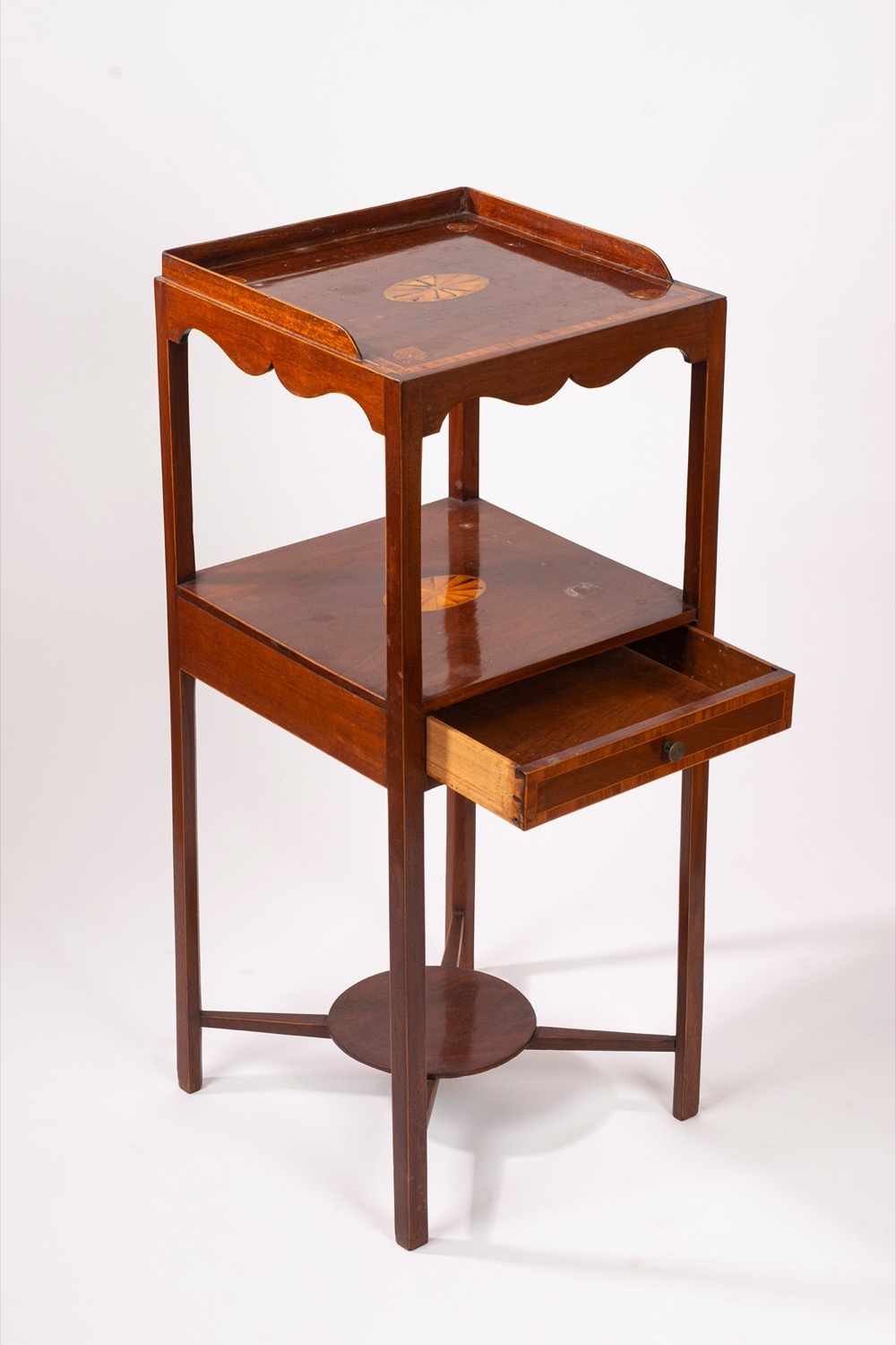 a due ripiani di forma quadrata decorati da rosone centrale: piano superiore con bordo rialzato, piano inferiore munito di cassetto