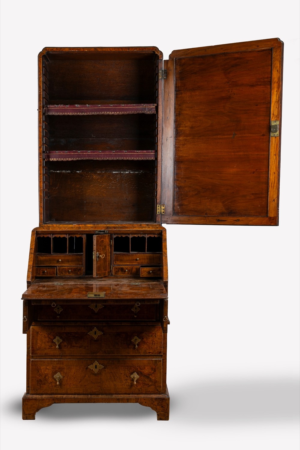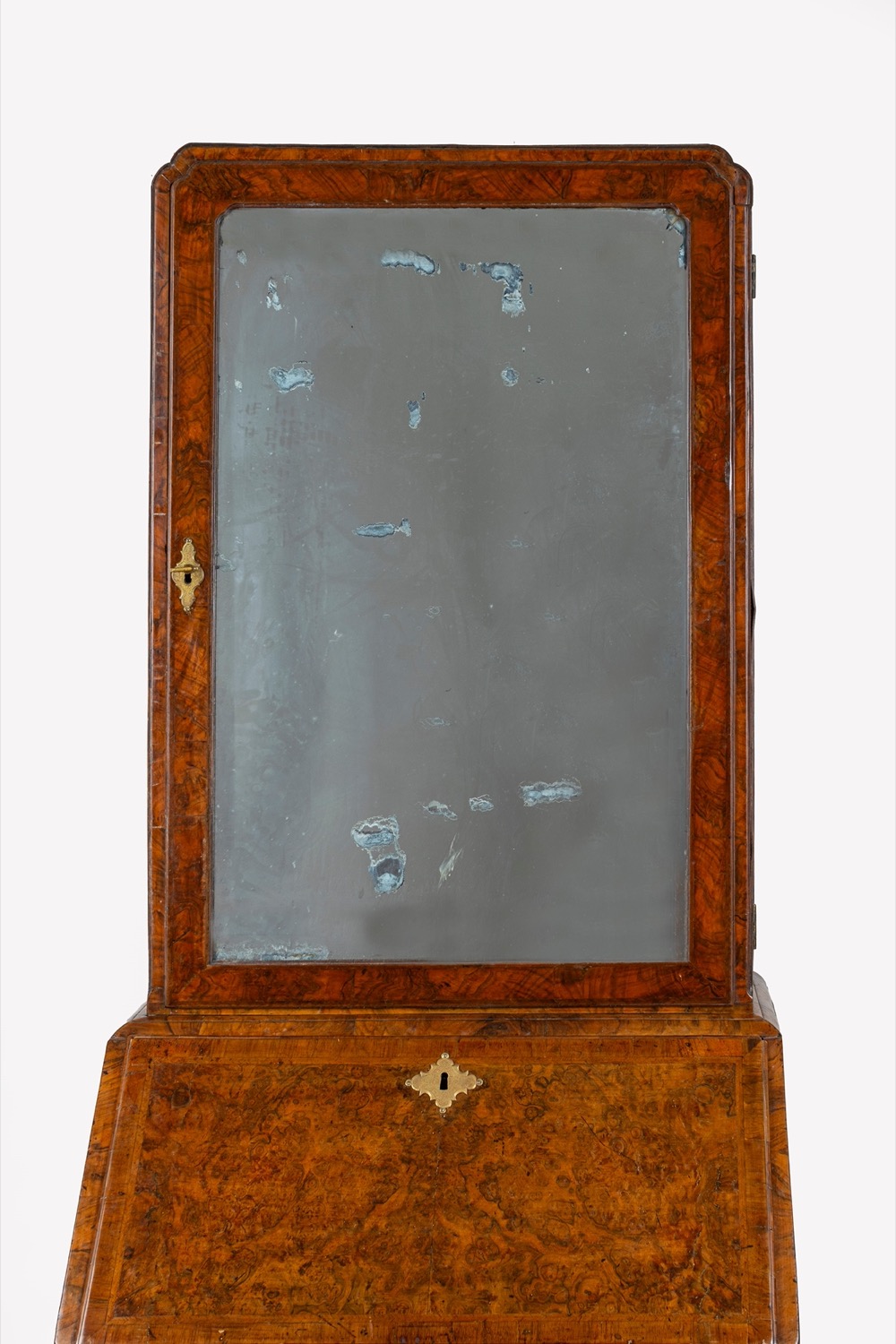 lievi difetti, restauri e sostituzioni parte superiore con anta a specchio celante due ripiani; parte inferiore a ribalta con fronte a tre cassetti e pianetto estraibile, con calatoia celante sei tiretti, sei vani e sportello centrale apribile