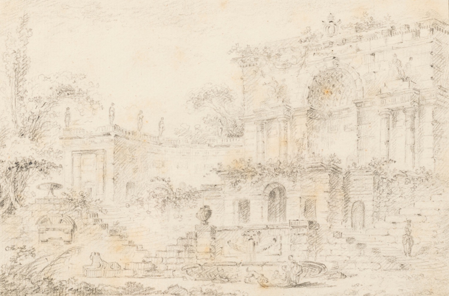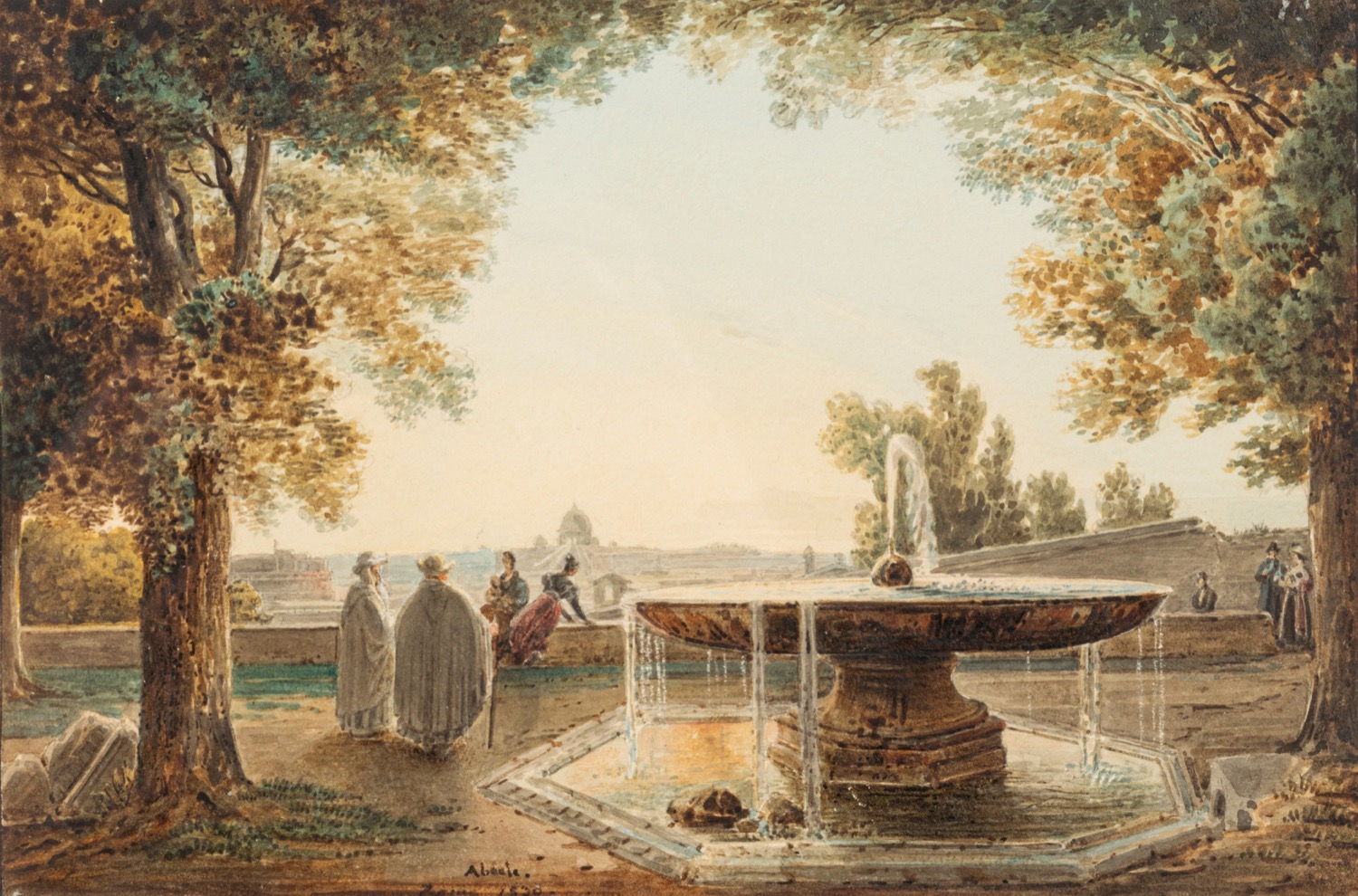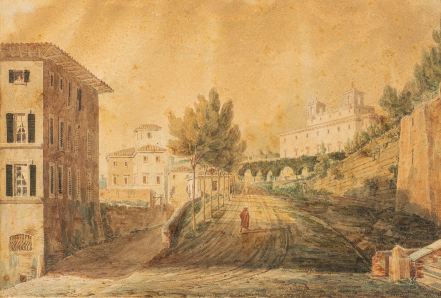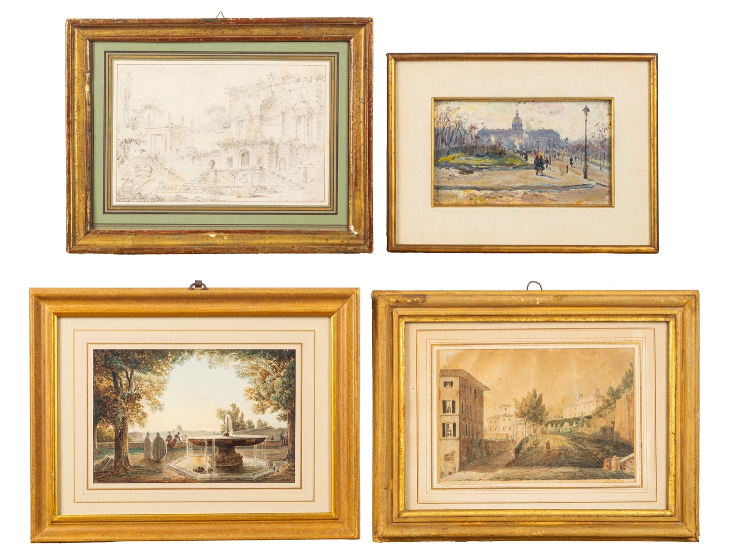 un disegno e due acquerelli con vedute di Roma; un olio con veduta probabilmente dei giardini di Charlottenburg a Berlino un disegno e due acquerelli con vedute di Roma; un olio con veduta probabilmente dei giardini di Charlottenburg a Berlino
