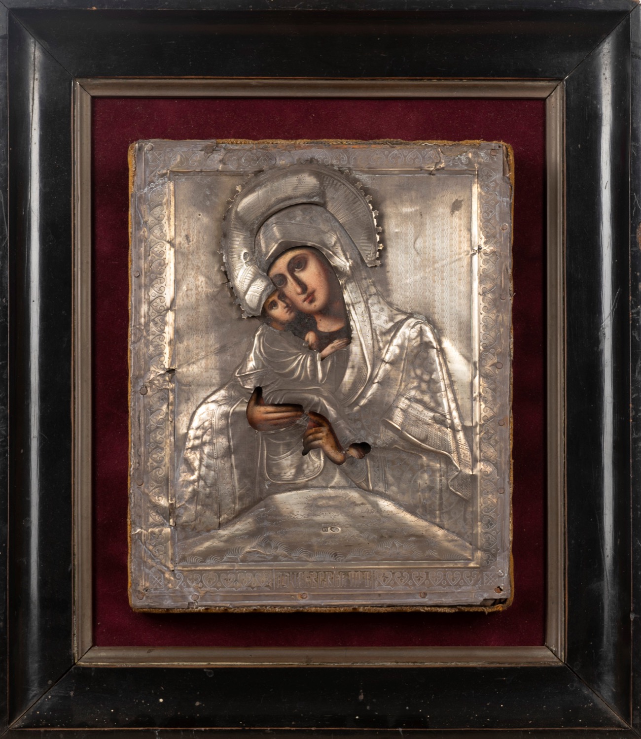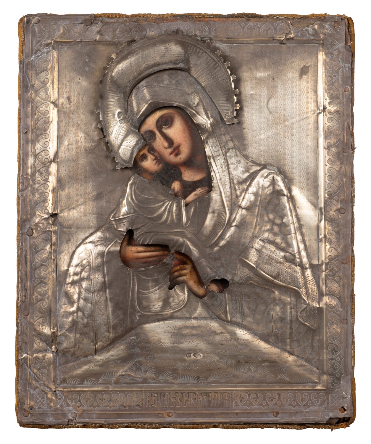 Icona con riza in argento raffigurante Madonna di Vladimir. Russia, secolo XIX