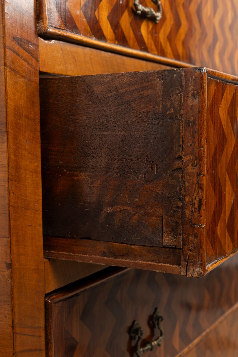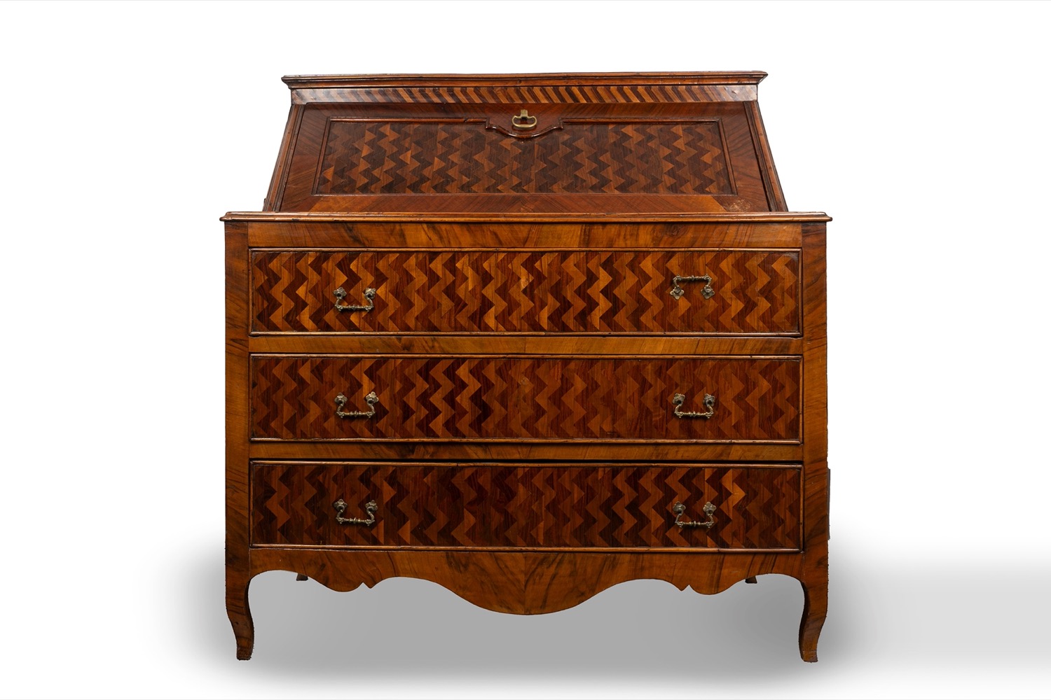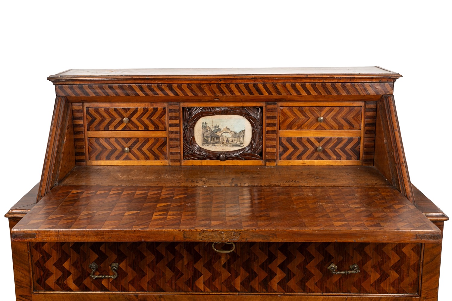 Ribalta in legno intarsiato a motivi geometrici, secolo XVIII