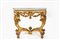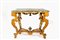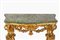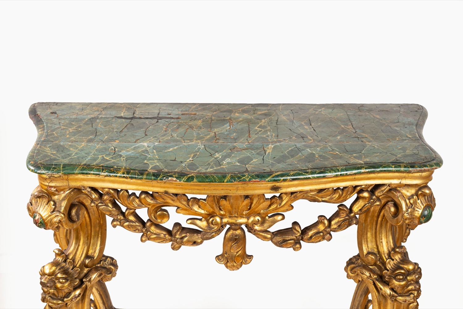 in legno intagliato e dorato, con piano in finto marmo verde, gambe riunite da crociera centrata da vaso in finto marmo verde che richiama il piano, quattro mascheroni e motivi a rocaille sulle gambe a doppia voluta, piedi leonini.