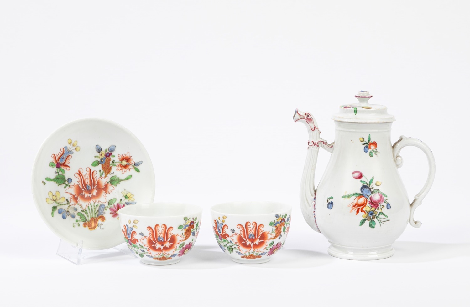 Manifattura di Ginori a Doccia. Le tazzine ad ansa mossa ed il piattino decorati col motivo del "tulipano"; la caffettiera decorata col motivo del "mazzetto", versatoio zoomorfo, ansa a voluta, il coperchio con mancanza al finale della presa Manifattura di Ginori a Doccia. Le tazzine ad ansa mossa ed il piattino decorati col motivo del "tulipano"; la caffettiera decorata col motivo del "mazzetto", versatoio zoomorfo, ansa a voluta, il coperchio con mancanza al finale della presa