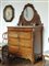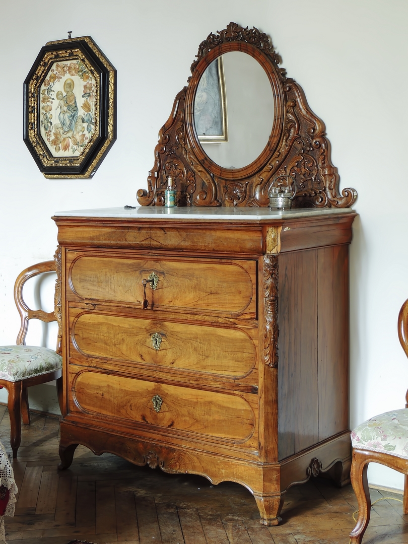 CASSETTONE IMPIALLACCIATO IN NOCE metà del XIX secolo piano in marmo, angoli scantonati intagliati con mascheroni, un cassetto nella fascia e tre sottostanti, piedi mossi corredato di specchiera ovale riccamente intagliata con motivi vegetali il cassettone h cm 116x129x63, la specchiera cm 83x117 (2)