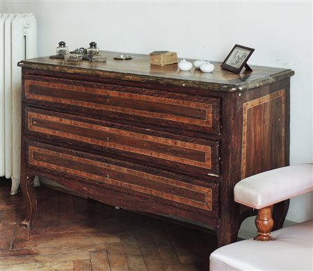 CASSETTONE IN LEGNO LACCATO metà del XVIII secolo dipinto ad imitazione di intarsiatura e radica, fronte a tre cassetti, gambe mosse, lievi difetti h cm 92x121x56