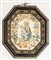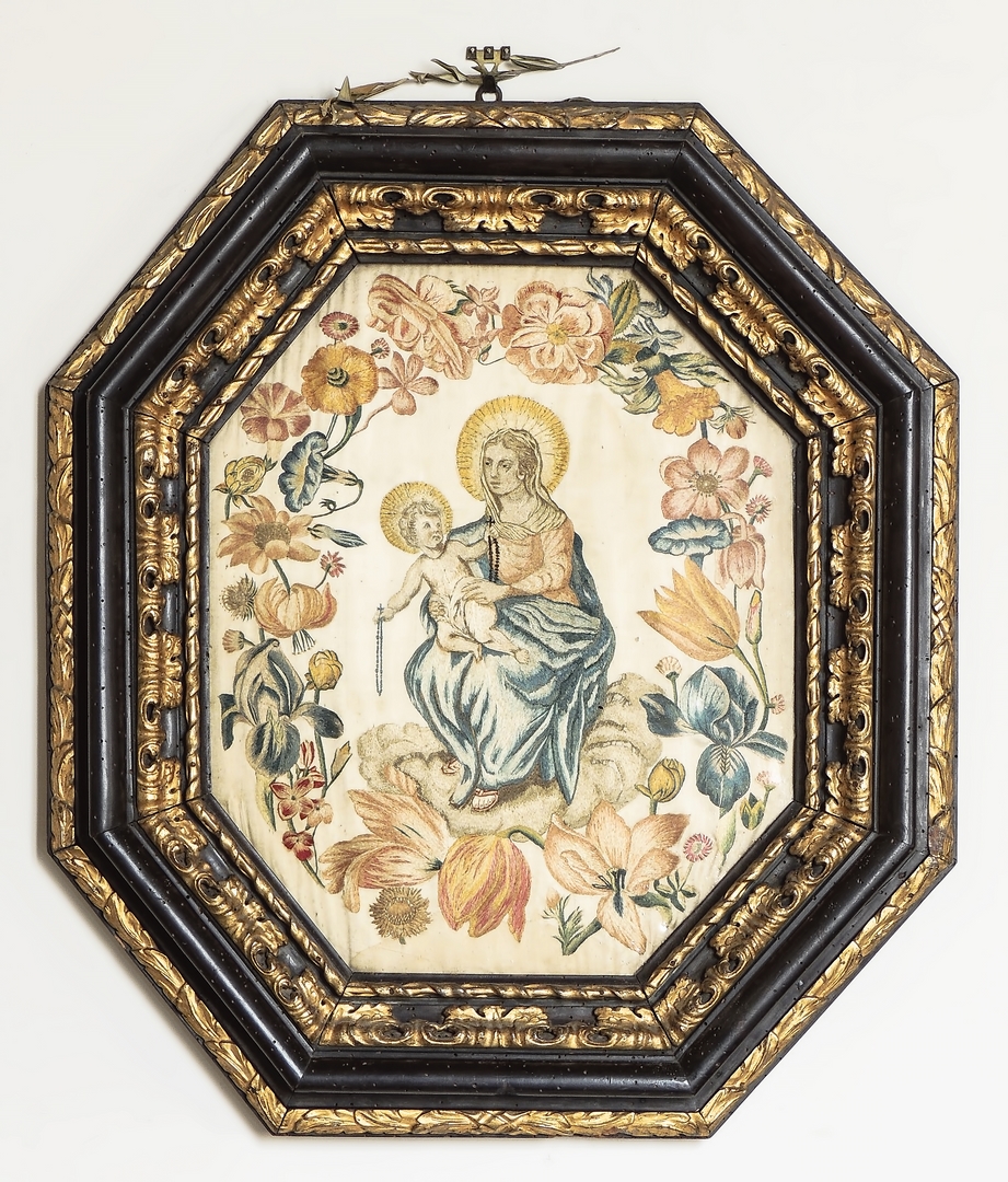 CORNICE OTTAGONALE IN LEGNO EBANIZZATO E IN PARTE DORATO Italia centrale, XVII secolo intagliata con motivi vegetali, contenente pannello devozionale in seta ricamato con Madonna con Bambino entro ghirlanda di fiori la luce cm 52x42