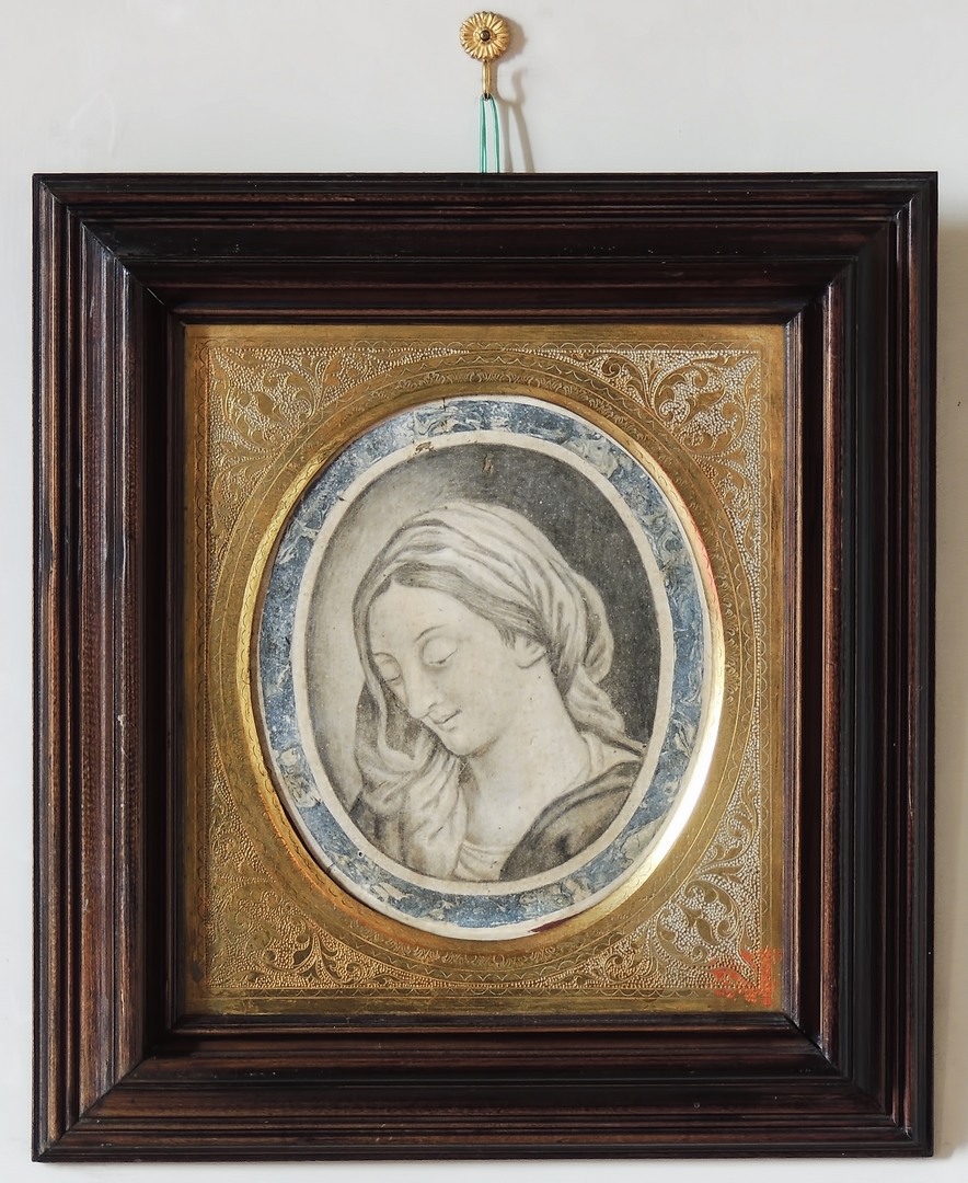 VOLTO DI MADONNA XVII secolo olio su scagliola applicata a placca in ardesia, in cornice di epoca posteriore in legno e ottone difetti cm 20,5x17,5
