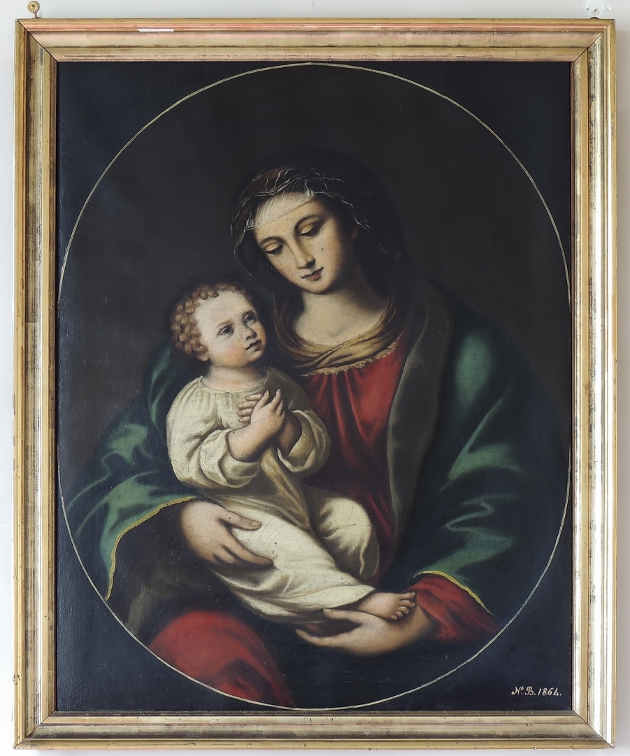 SCUOLA TOSCANA DEL XIX SECOLO Madonna con Bambino olio su tela siglato e datato 1864, in cornice dorata cm 98,5x74,5