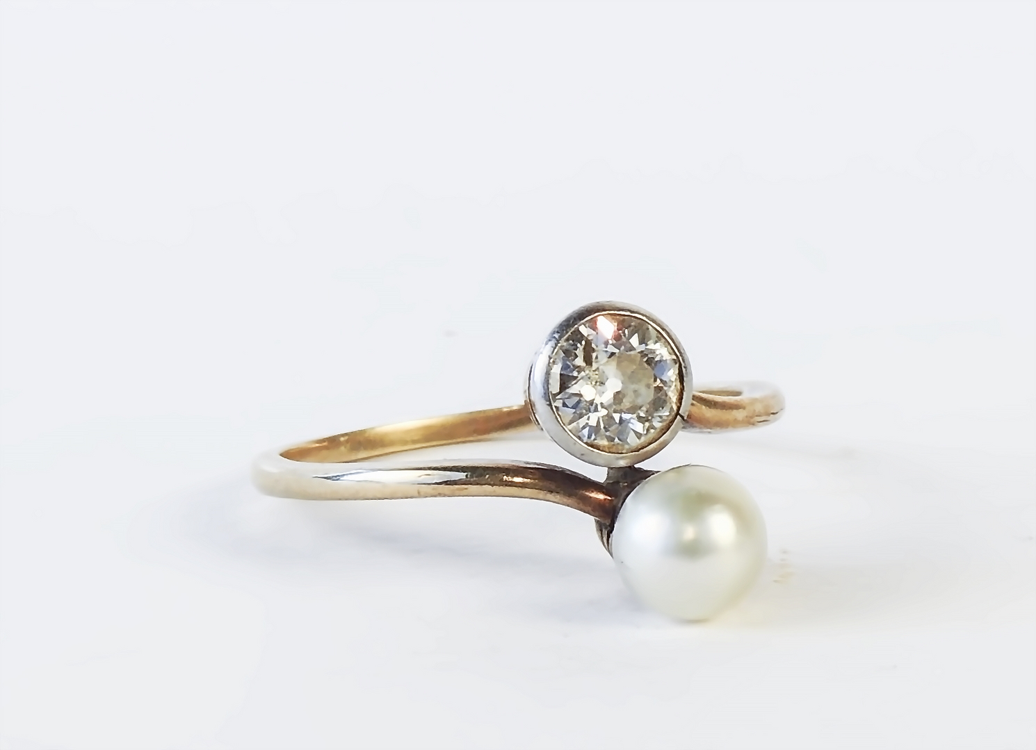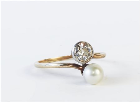 ANELLO CONTRARIÉ IN ORO, PERLA E DIAMANTE inizio del XX secolo impreziosito da diamante taglio vecchio ct 0,60 circa