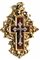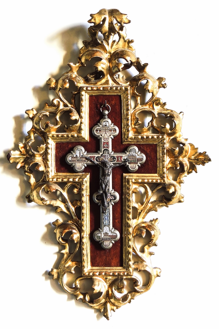 PICCOLO CROCIFISSO IN METALLO E MICRO MOSAICO XIX secolo montato su cornice a corce in legno dorato intagliato con volute e foglie d'acanto, lievi difetti cm 46x29,5
