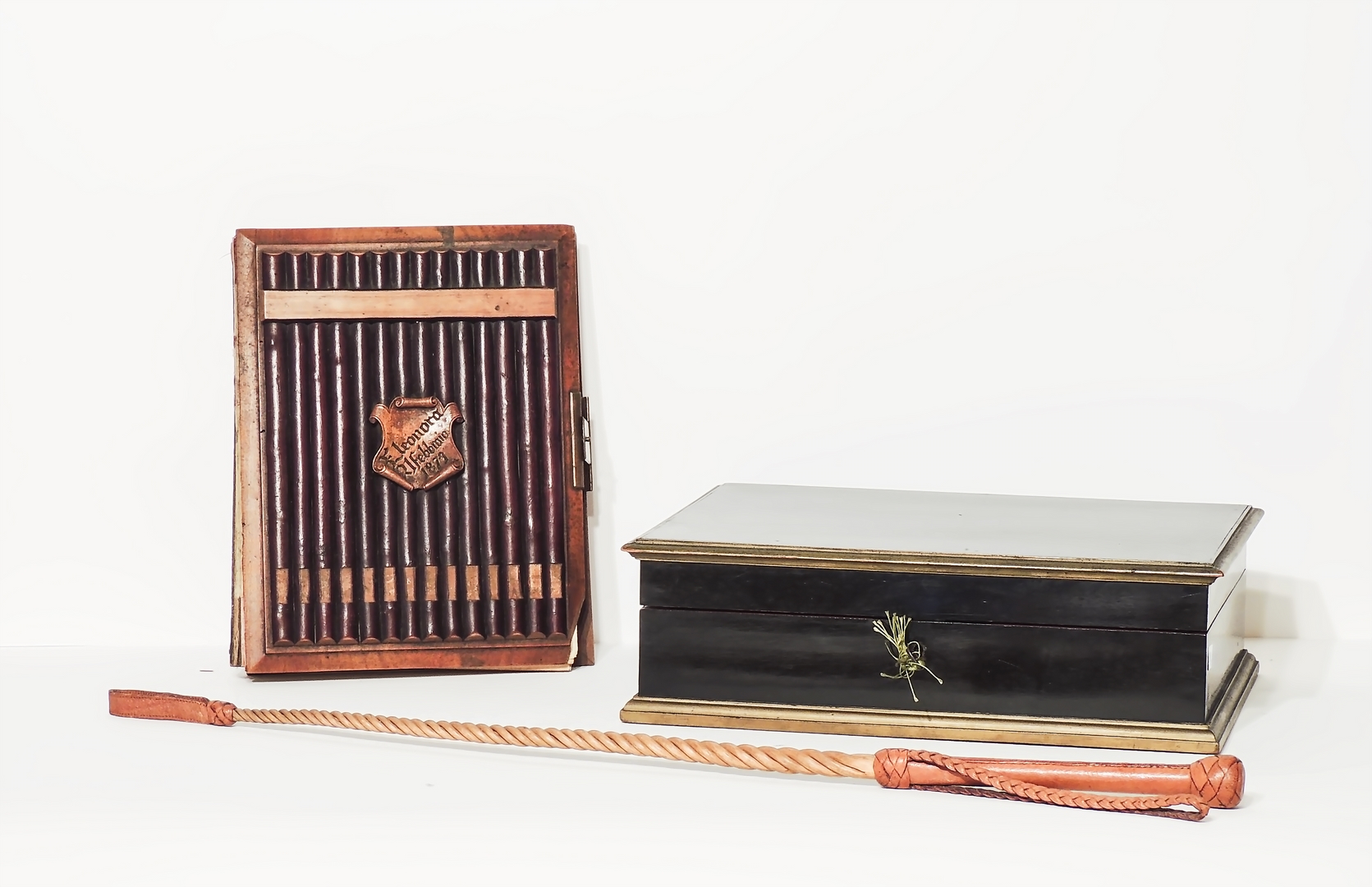 LOTTO DI CURIOSITÀ D'EPOCA tra cui una scatola in legno ebanizzato, un frustino da equitazione e album contenente fotografie e cartes de visite d'epoca, legatura in legno (3)