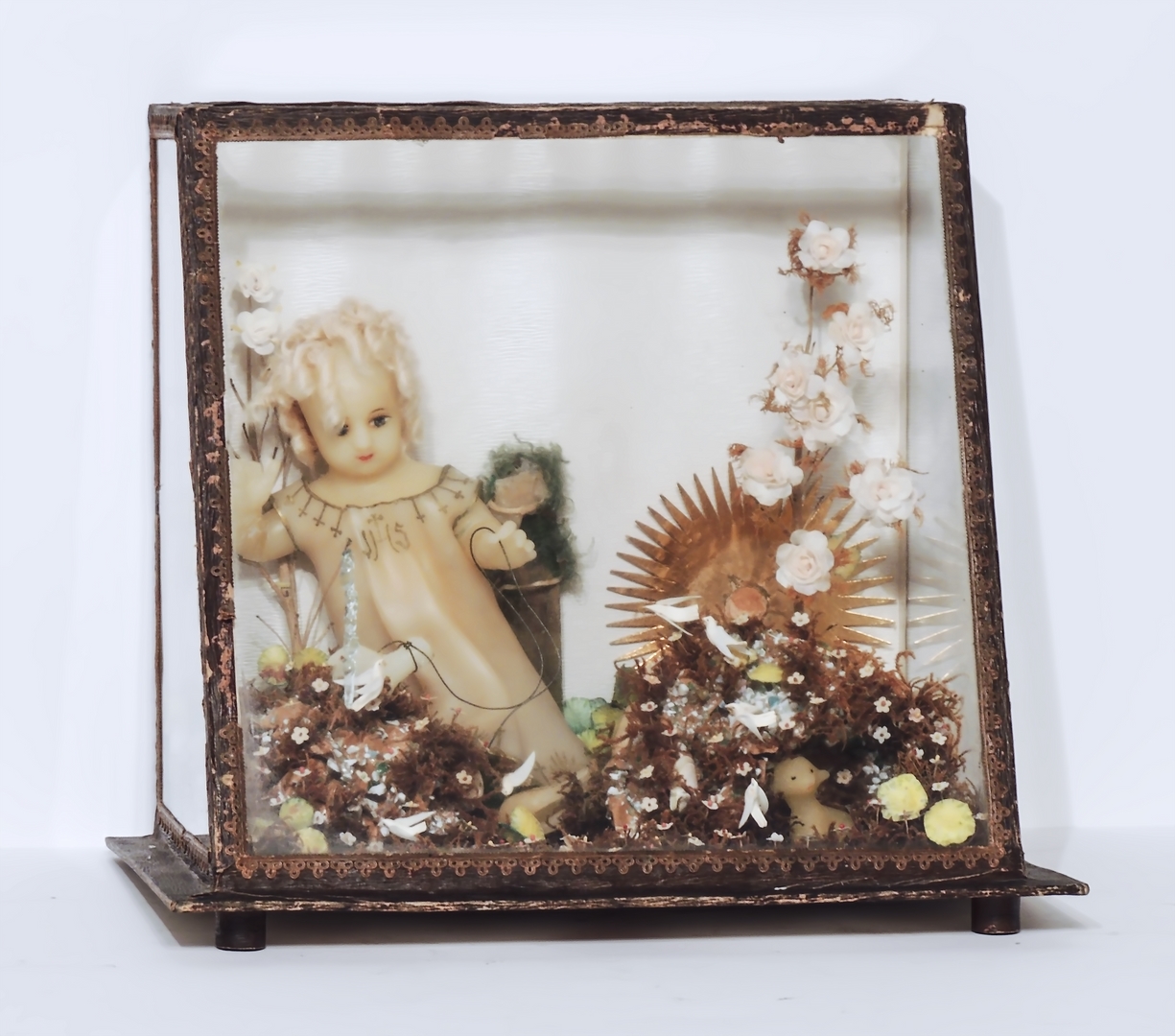 GESÙ BAMBINO IN CERA CON TRIONFO DI FIORI XIX secolo entro teca in vetro h cm...