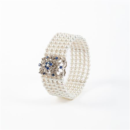 BRACCIALE a cinque fili di perle coltivate Giappone, susta in oro bianco 18 KT con diamante taglio brillante ct. 0,05 e zaffiri ct. 0,40 (g. 40,65) (uno zaffiro mancante).