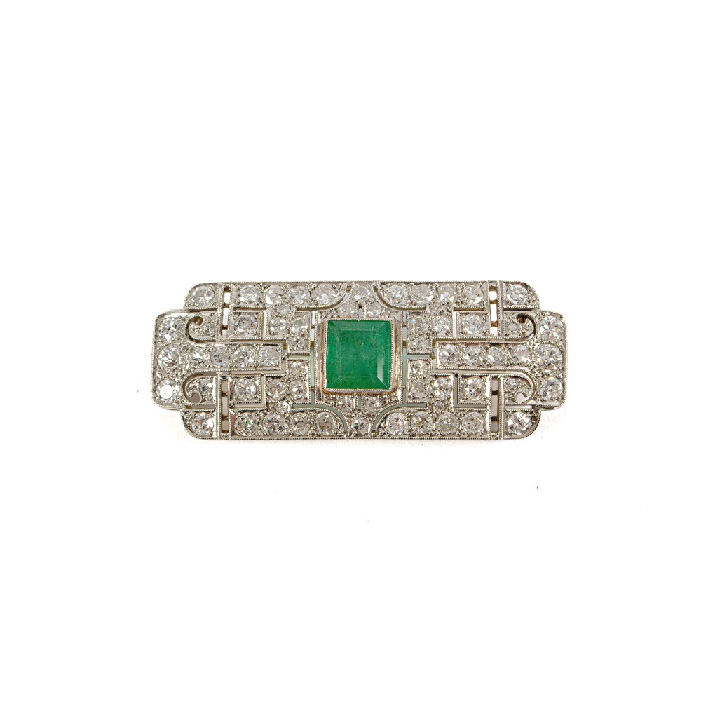 SPILLA in platino con diamanti vecchio taglio ct. 3,00 e smeraldo ct. 3,00 (g. 9,50).