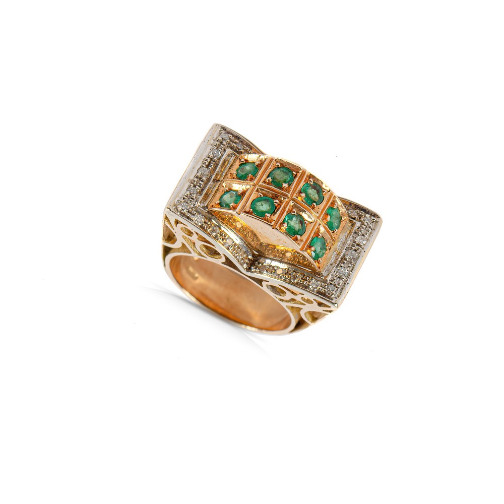 ANELLO in oro giallo e bianco 18 KT con brillanti e smeraldi