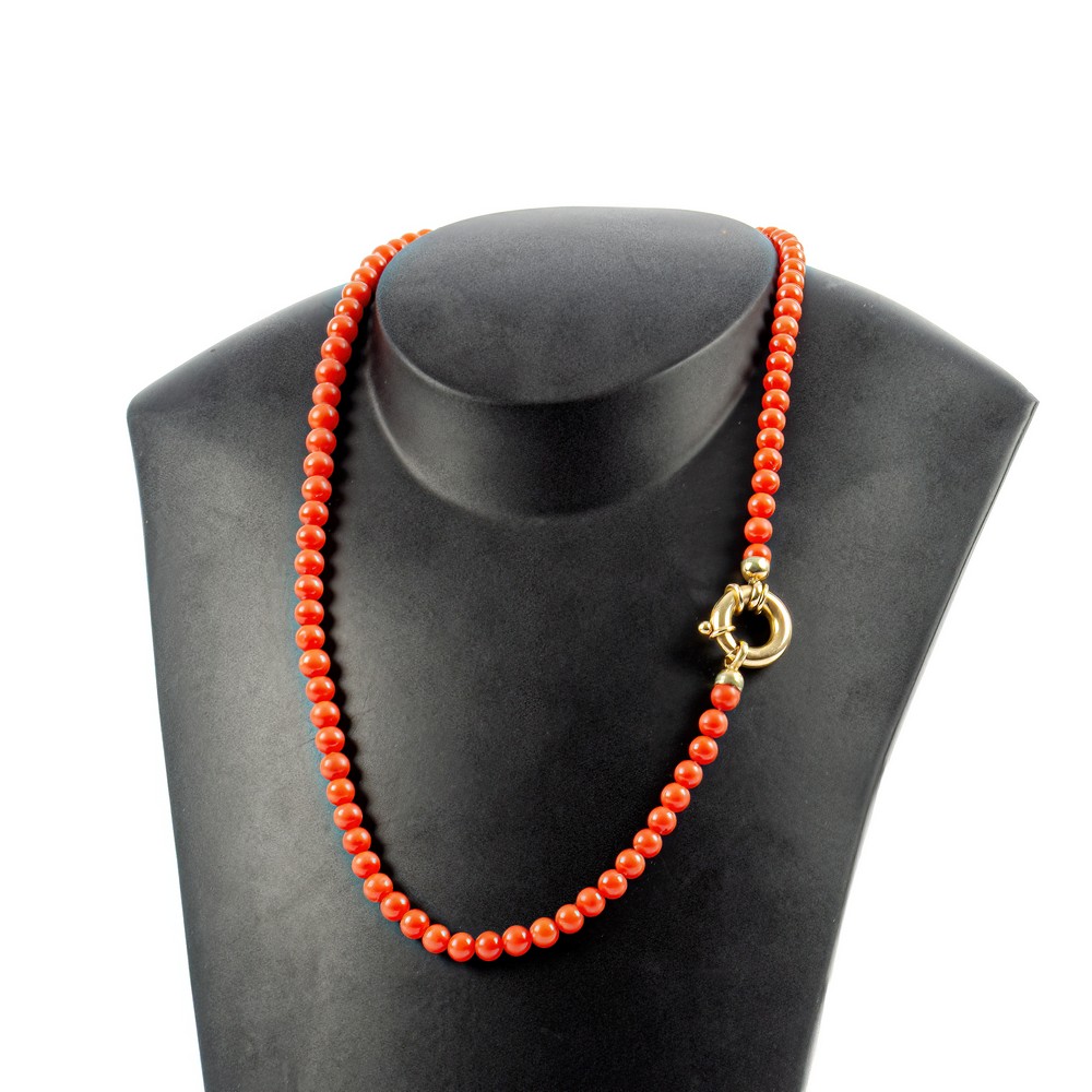 COLLANA con sfere di corallo, susta in oro giallo 18 KT (g. 22,80).
