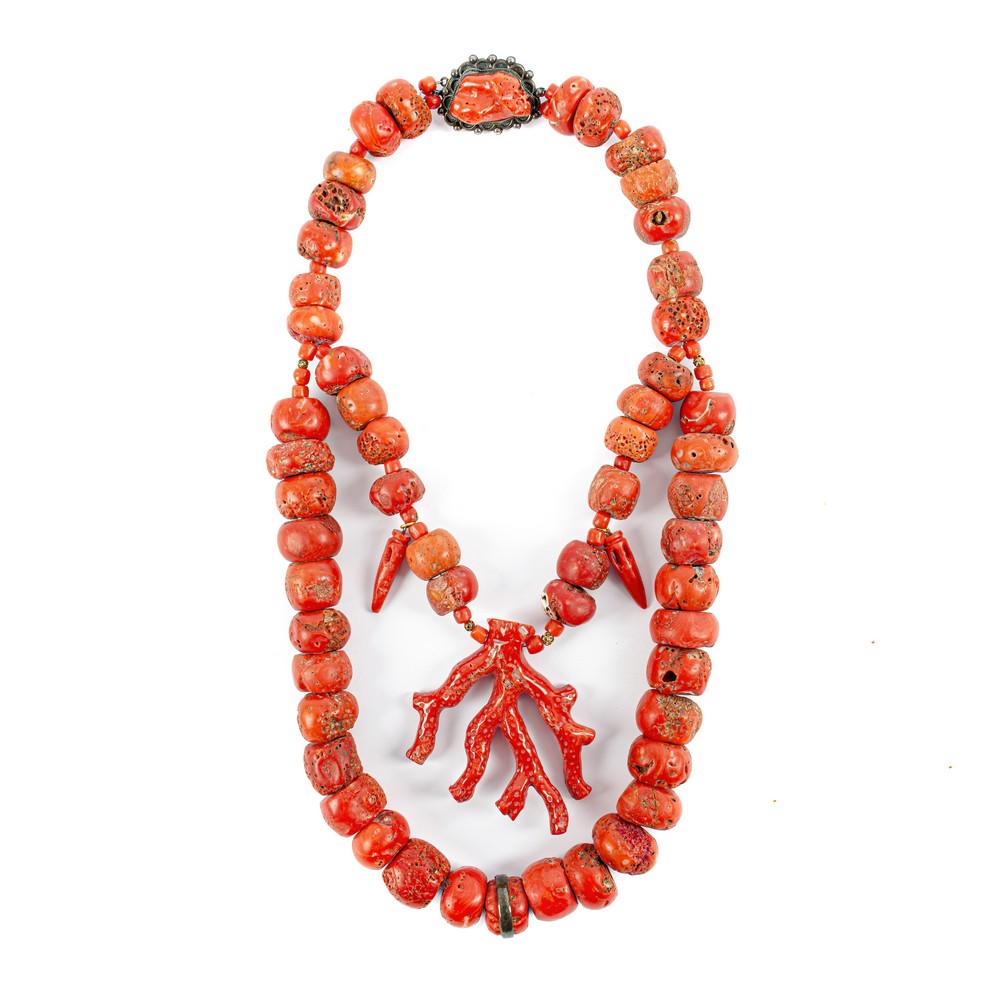 COLLANA in corallo con tralcio e piccole anfore in corallo, susta in argento (g. 547).