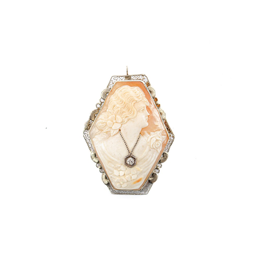 SPILLA/PENDENTE in oro bianco 9 KT con cammeo e brillante