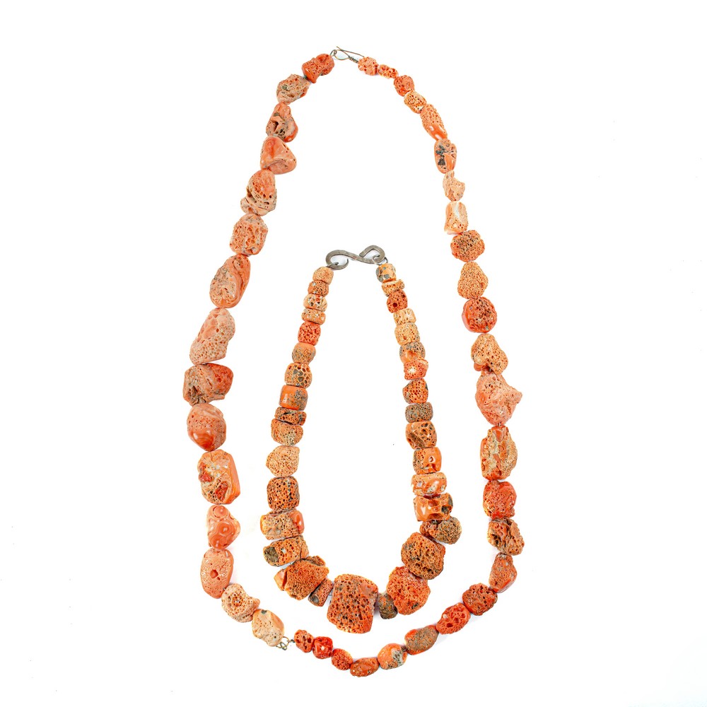 Collana a due fili in corallo con chiusura in oro giallo 18 KT e collana in corallo con chiusura in argento (g. 868).