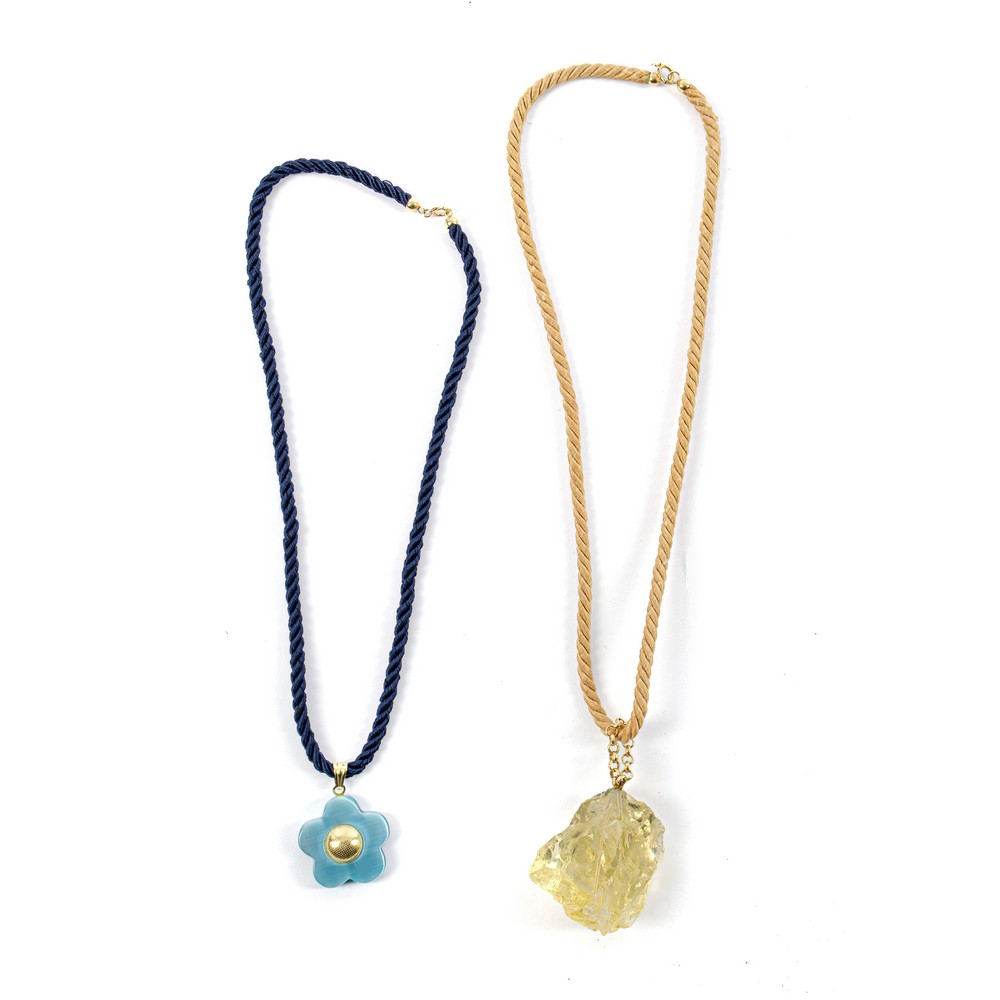 Collana in corda e oro giallo 18 KT con quarzo citrino e collana in corda e oro 18 KT con ciondolo in pasta vitrea.