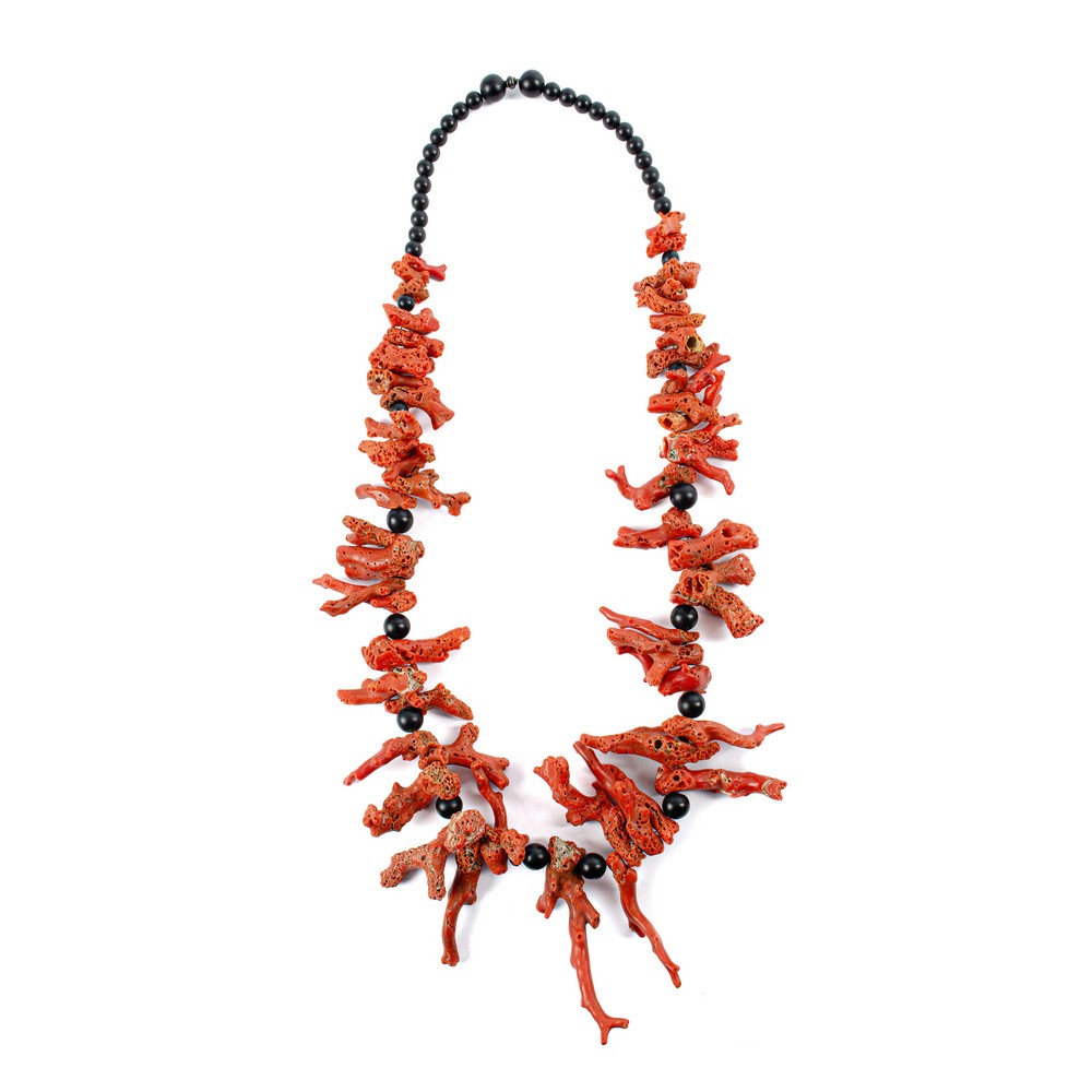 COLLANA con tralci di corallo e sfere di pietra lavica
