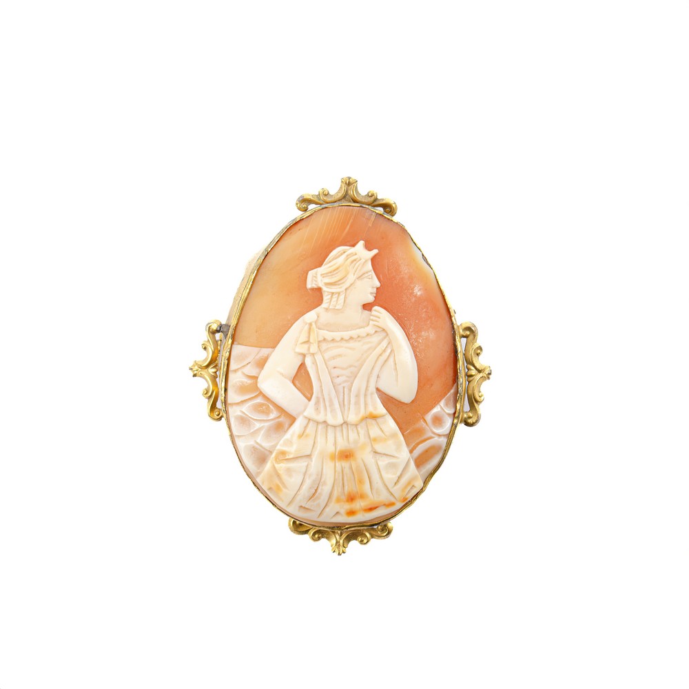 SPILLA in metallo dorato con cammeo raffigurante "Figura femminile" (g. 14,90)(usura).