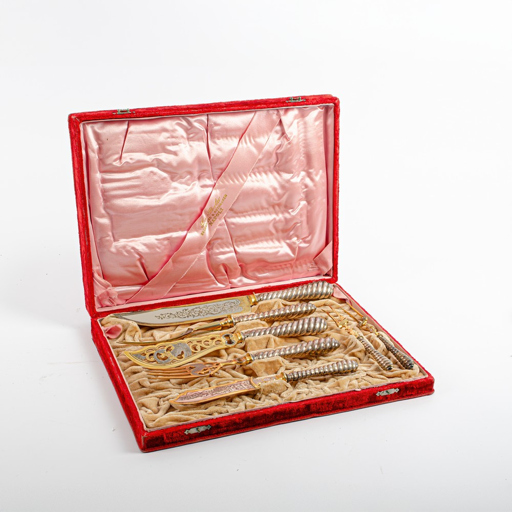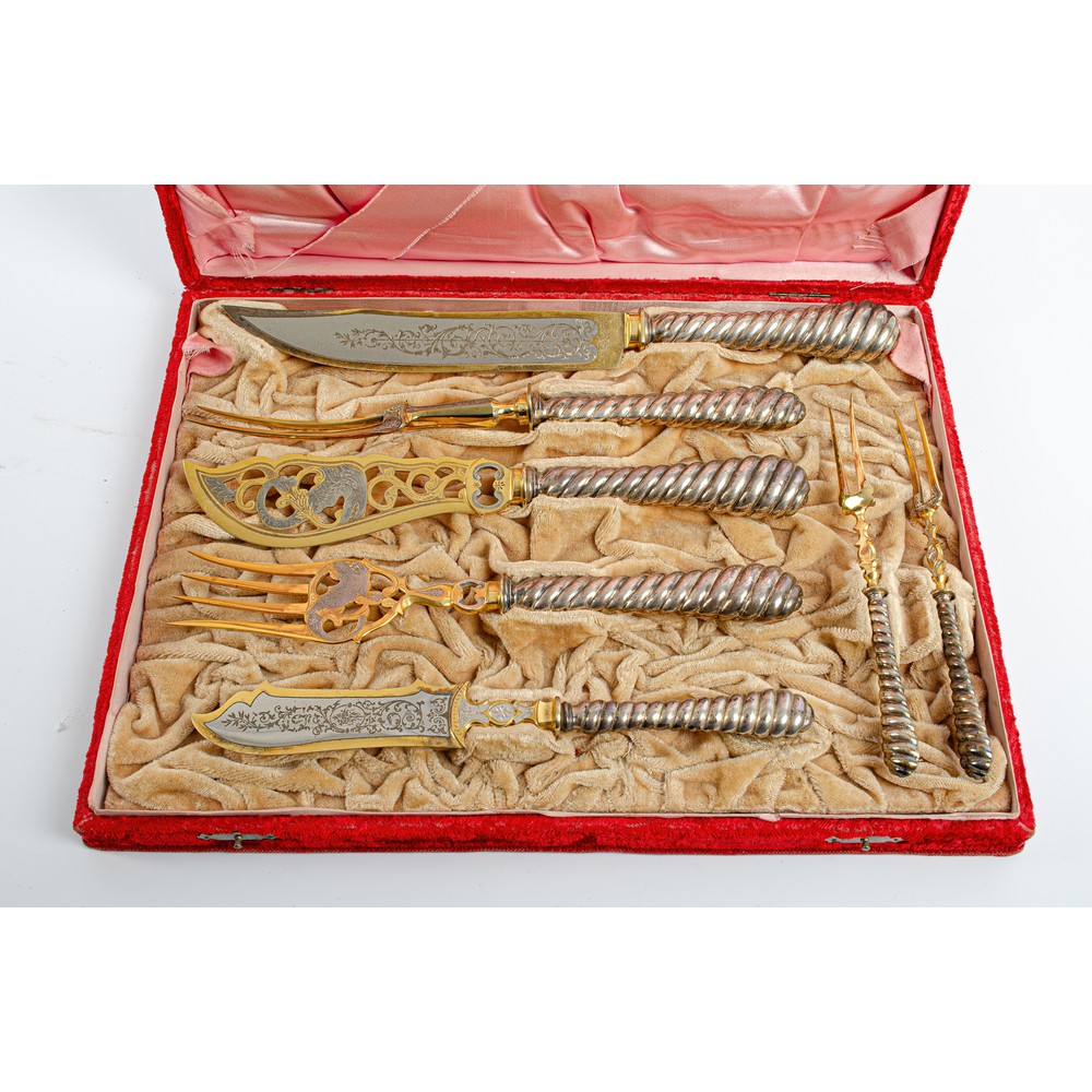 Set da tavola in lamina d' argento entro custodia. Punzone argentiere W B.