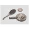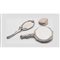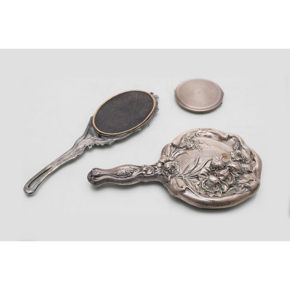 Specchio da toletta liberty in metallo lavorato raffigurante "Figura femminile", specchio da toletta in argento sterling sbalzato a motivo floreale e fogliaceo e portacipria Giorgio VI Birmingham 1939 (g. 578 peso lordo).