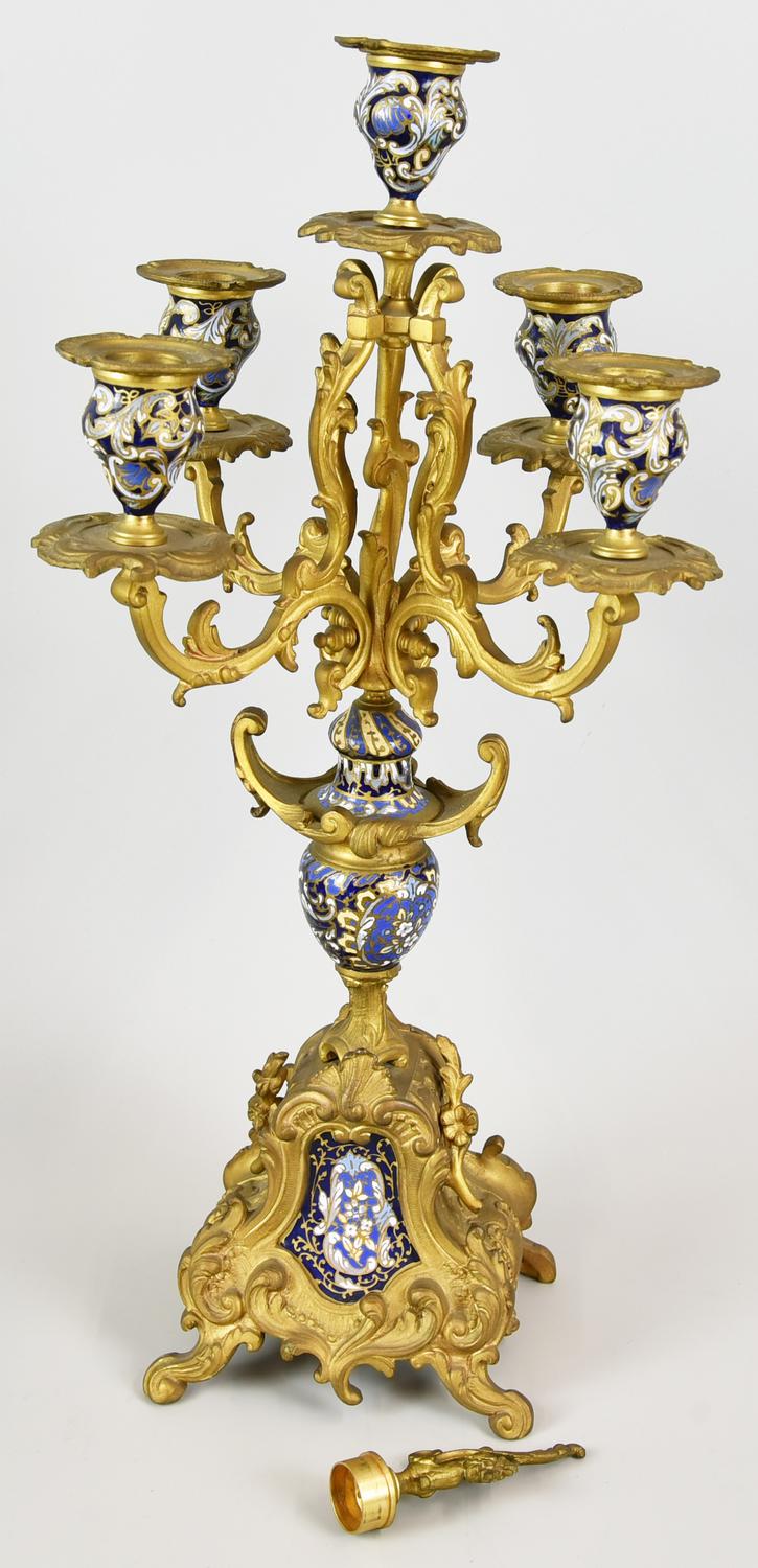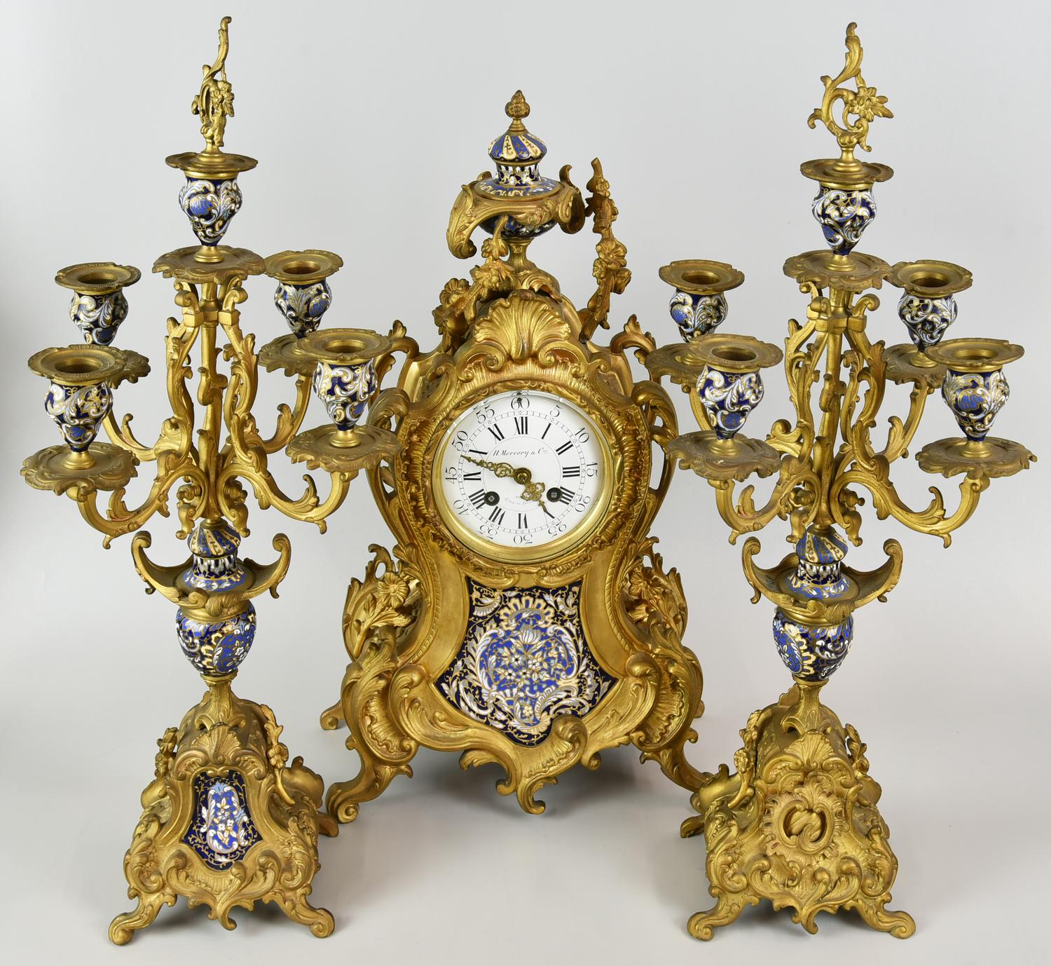 TRITTICO COMPOSTO DA OROLOGIO E DUE CANDELABRI, inizi XX secolo bronzo dorato...
