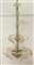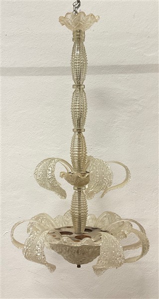 Lampadario in vetro soffiato decorato da foglie in vetro baccellato e scanalato, montatura in ottone e legno. Anni '30/'40. (h cm 90; d cm 49) (difetti e mancanze)