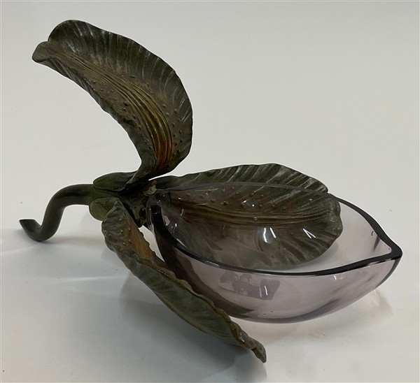 Ciotolina in vetro ametista chiaro trasparente a forma di frutto con applicate foglie in metallo patinato giallo, verde e rosso. Secolo XX. (cm 20x11)