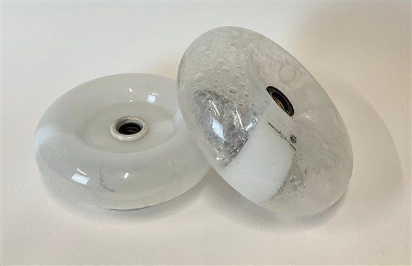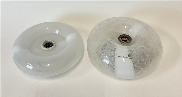 Due plafoniere. Italia, anni '70. Vetro soffiato a bolle e opalescente con fascia in vetro lattimo. (d max cm 31) (lievi difetti)
