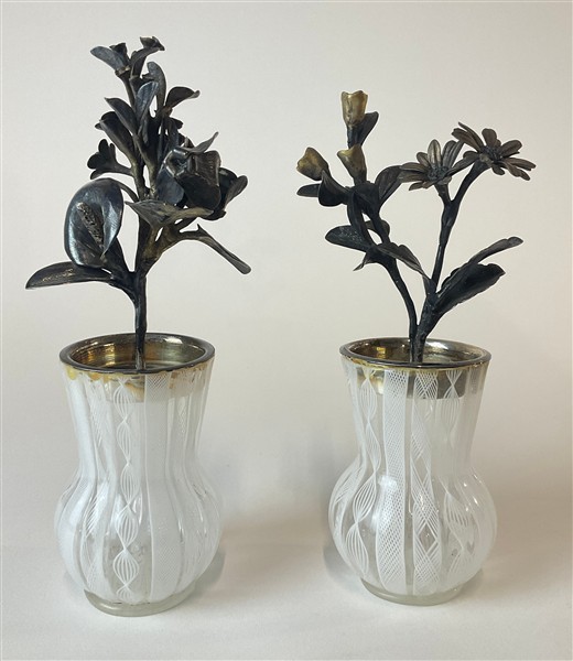 Manifattura di Murano Coppia di vasetti in vetro soffiato a zanfirico e retortol