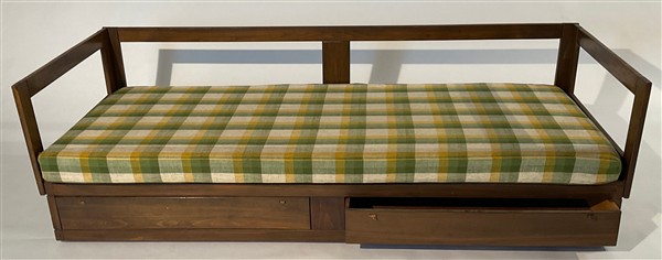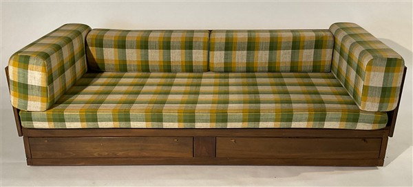 Divano letto in legno con due cassetti alla base, struttura in legno massello, cuscini rivestiti in tessuto scozzese verde, giallo e beige. Prese dei cassetti in cuoio. (lievi difetti e piccole mancanze)