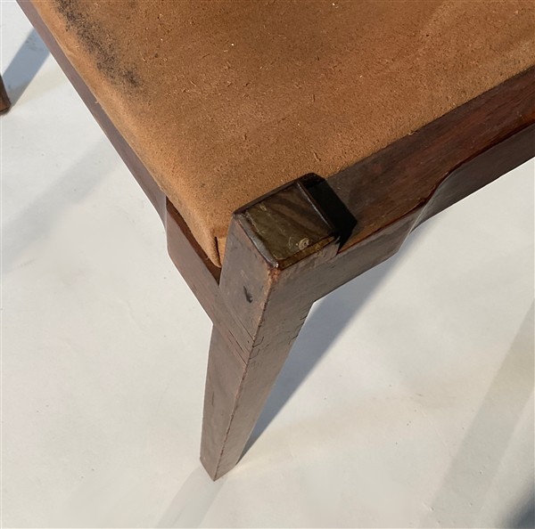 Tre sedie. Italia, anni '60. Struttura in legno e seduta imbottita e rivestita in alcantara. (cm 47x75,5x45) (difetti)