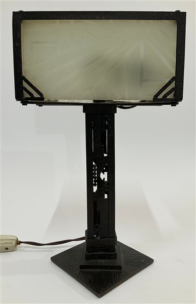 Lot 1836 | Lampada da tavolo Art Déco in ferro forgiato e saldato, eparalume in vetro acid