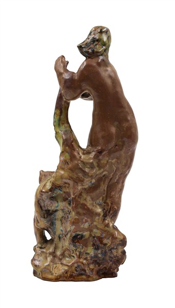 Scultura in ceramica smaltata nei toni del blu, beige e verde raffigurante ninfa con satiro. Milano, anni '50. Recante etichetta cartacea della manifattura. (h cm 29)