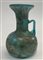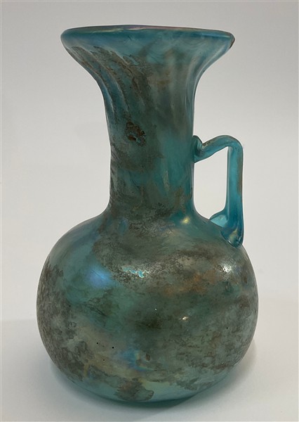Piccolo vaso in vetro soffiato azzurro con superficie iridata e decorata a effetto scavo, ansa applicata a caldo. Italia, seconda metà secolo XX. (h cm 16,5)