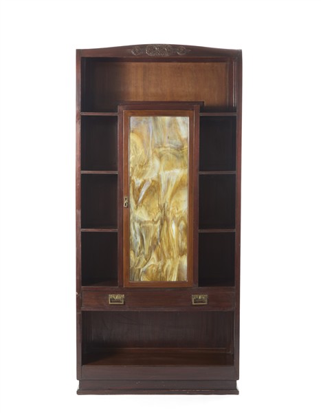 Mobile bar/libreria a otto vani a giorno, un cassetto e uno stipo ad anta. Milano, 1900ca. Legno massello di mogano, maniglie in ottone, anta con vetro di Murano calcedonio nei toni del lattimo e del giallo, a imitare l'alabastro. Cimasa intagliata a bassorilievo con fiori. (cm 90x189x33) (lievi difetti e restauri)