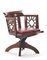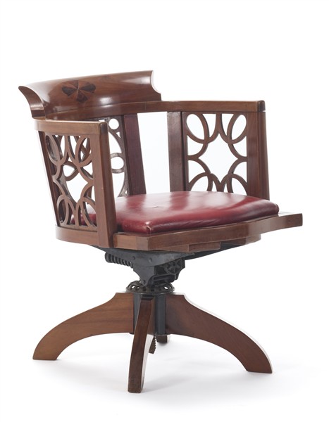 Poltroncina girevole in legno con schienale a giorno traforato e decorato da intagli geometrici e intarsi, seduta in cuoio decorato a dorature. Genova, anni '10/'20. (cm 54,5x74x48)