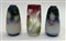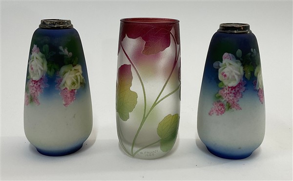 Tumbler in vetro soffiato cammeo trasparente inciso all'acido nei toni dell'ametista, verde e giallino con decoro vegetale. Firmato e datato a rilievo alla base "A. FAUCCI 1989". Unito a due vasetti a forma di goccia in ceramica opaca decorata da fiori. (h max cm 14,5) (lievi difetti)
