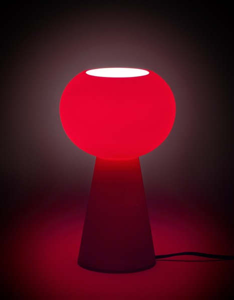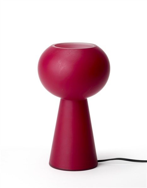 Rara lampada da tavolo modello "Oscar". Produzione Leucos, Murano, anni '90. Vetro incamiciato ametista, lattimo e trasparente. Recante etichetta del produttore. (h cm 27,5)