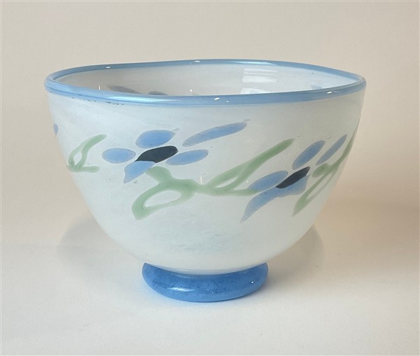 Coppa in vetro soffiato lattimo e celeste con murrine floreali. Seconda metà secolo XX. (h cm 11; d cm 15,5)