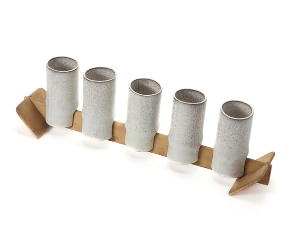 Alessio Tasca Set di cinque bicchierini in gres smaltato grigio, base in legno.