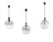 Lotto di tre lampade a sospensione con struttura in metallo cromato e globi diffusori in metallo soffiato trasparente incolore con fascia orizzontale in vetro lattimo. Murano, anni '70. (h cm 90; d cm 30) (lievi difetti)