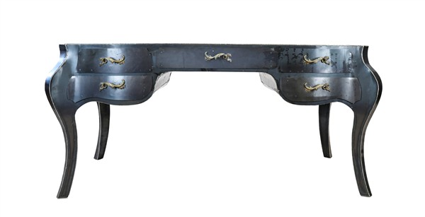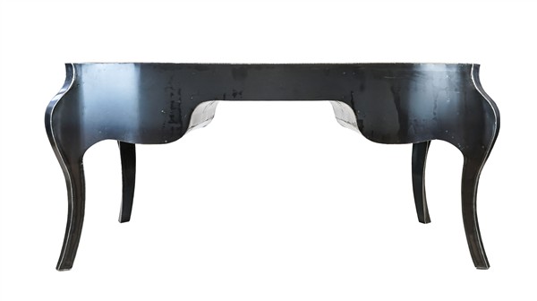 Scrivania da centro di forma mossa in ferro verniciato nero con cinque cassetti