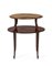 Tavolino con doppio ripiano ovale intarsiato in legni vari a paesaggio, monogra