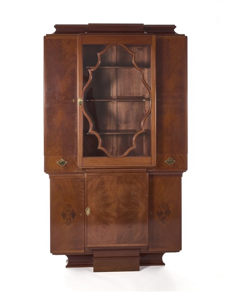 Libreria con anta centrale vetrata decorata da motivo geometrico. Due ante sopra tiretto sui lati, parte inferiore intarsiata a tre ante, elementi in metallo ottonato. Genova, anni '10/'20. (cm 130x228x46)
