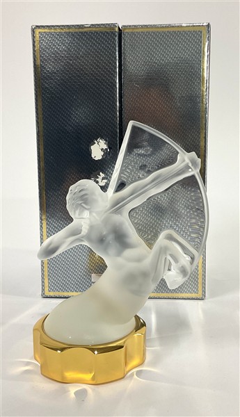 Tappo per radiatore in vetro pressato a forma di Sagittario in base bronzo dorato. Francia, anni '80/'90. In scatola originale. (h cm 16) (mancanze)